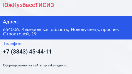 ЮжКузбассТИСИЗ по адресу 654006, Кемеровская область, Новокузнецк, проспект Строителей, 19 в дальнейшем Организация, размещена в следующих категориях: