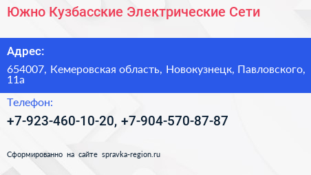 Южно-Кузбасские Электрические Сети по адресу 654007, Кемеровская область, Новокузнецк, Павловского, 11а в дальнейшем Организация, размещена в следующих категориях: