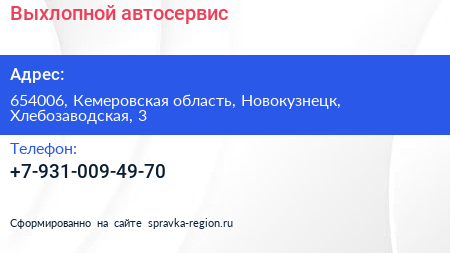 Выхлопной, автосервис по адресу 654006, Кемеровская область, Новокузнецк, Хлебозаводская, 3 в дальнейшем Организация, размещена в следующих категориях: