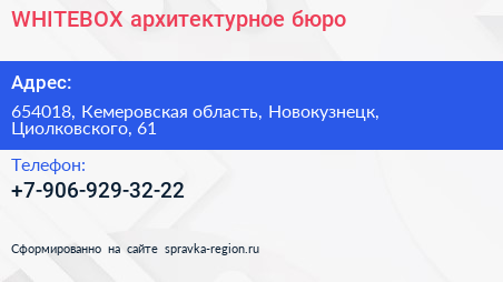 WHITEBOX, архитектурное бюро по адресу 654018, Кемеровская область, Новокузнецк, Циолковского, 61 в дальнейшем Организация, размещена в следующих категориях: