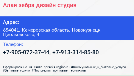 Алая зебра, дизайн-студия по адресу 654041, Кемеровская область, Новокузнецк, Циолковского, 4 в дальнейшем Организация, размещена в следующих категориях:
