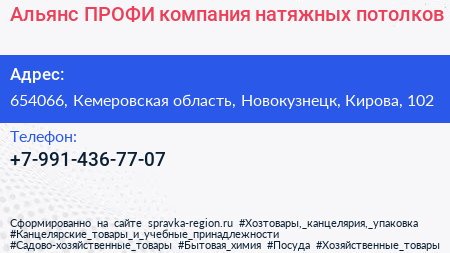 Альянс ПРОФИ, компания натяжных потолков по адресу 654066, Кемеровская область, Новокузнецк, Кирова, 102 в дальнейшем Организация, размещена в следующих категориях: