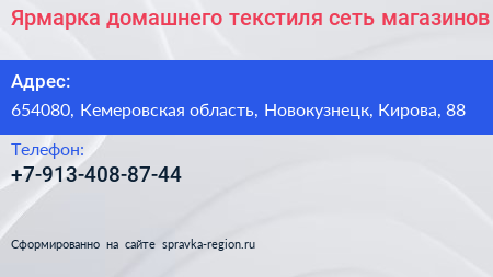 Ярмарка домашнего текстиля, сеть магазинов по адресу 654080, Кемеровская область, Новокузнецк, Кирова, 88 в дальнейшем Организация, размещена в следующих категориях:
