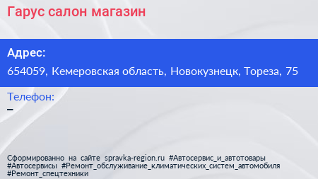 Гарус, салон-магазин по адресу 654059, Кемеровская область, Новокузнецк, Тореза, 75 в дальнейшем Организация, размещена в следующих категориях: