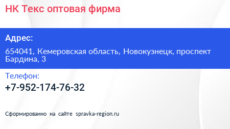 НК-Текс, оптовая фирма по адресу 654041, Кемеровская область, Новокузнецк, проспект Бардина, 3 в дальнейшем Организация, размещена в следующих категориях: