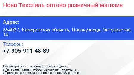 Ново-Текстиль, оптово-розничный магазин по адресу 654027, Кемеровская область, Новокузнецк, Энтузиастов, 16 в дальнейшем Организация, размещена в следующих категориях:
