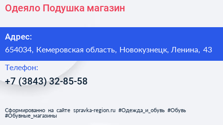 Одеяло & Подушка, магазин по адресу 654034, Кемеровская область, Новокузнецк, Ленина, 43 в дальнейшем Организация, размещена в следующих категориях: