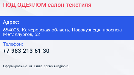 ПОД ОДЕЯЛОМ, салон текстиля по адресу 654005, Кемеровская область, Новокузнецк, проспект Металлургов, 52 в дальнейшем Организация, размещена в следующих категориях: