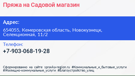 Пряжа на Садовой, магазин по адресу 654055, Кемеровская область, Новокузнецк, Селекционная, 11/2 в дальнейшем Организация, размещена в следующих категориях: