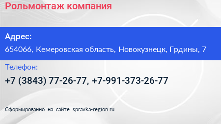 Рольмонтаж, компания по адресу 654066, Кемеровская область, Новокузнецк, Грдины, 7 в дальнейшем Организация, размещена в следующих категориях: