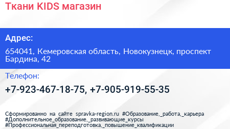 Ткани KIDS, магазин по адресу 654041, Кемеровская область, Новокузнецк, проспект Бардина, 42 в дальнейшем Организация, размещена в следующих категориях: