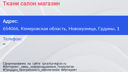 Ткани, салон-магазин по адресу 654066, Кемеровская область, Новокузнецк, Грдины, 1 в дальнейшем Организация, размещена в следующих категориях: