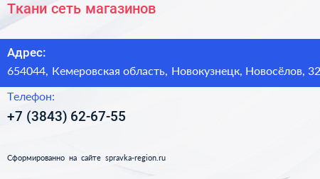 Ткани, сеть магазинов по адресу 654044, Кемеровская область, Новокузнецк, Новосёлов, 32 в дальнейшем Организация, размещена в следующих категориях: