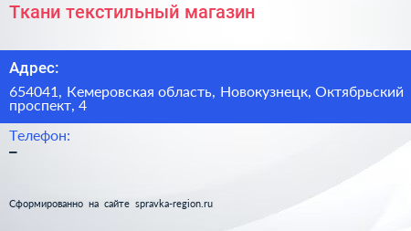 Ткани, текстильный магазин по адресу 654041, Кемеровская область, Новокузнецк, Октябрьский проспект, 4 в дальнейшем Организация, размещена в следующих категориях: