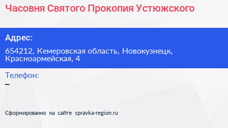 Часовня Святого Прокопия Устюжского по адресу 654212, Кемеровская область, Новокузнецк, Красноармейская, 4 в дальнейшем Организация, размещена в следующих категориях: