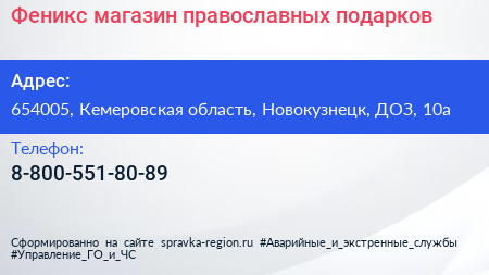 Феникс, магазин православных подарков по адресу 654005, Кемеровская область, Новокузнецк, ДОЗ, 10а в дальнейшем Организация, размещена в следующих категориях: