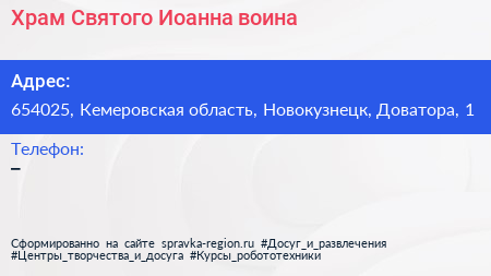 Храм Святого Иоанна воина по адресу 654025, Кемеровская область, Новокузнецк, Доватора, 1 в дальнейшем Организация, размещена в следующих категориях: