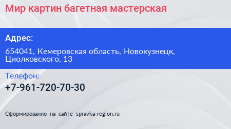 Мир картин, багетная мастерская по адресу 654041, Кемеровская область, Новокузнецк, Циолковского, 13 в дальнейшем Организация, размещена в следующих категориях: