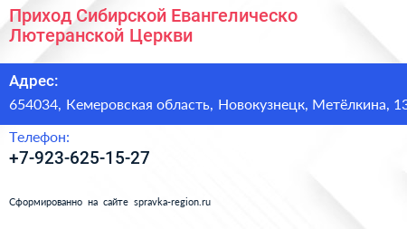 Приход Сибирской Евангелическо-Лютеранской Церкви по адресу 654034, Кемеровская область, Новокузнецк, Метёлкина, 13 в дальнейшем Организация, размещена в следующих категориях:
