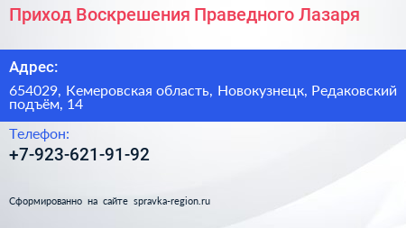 Приход Воскрешения Праведного Лазаря по адресу 654029, Кемеровская область, Новокузнецк, Редаковский подъём, 14 в дальнейшем Организация, размещена в следующих категориях: