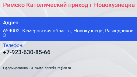 Римско-Католический приход г. Новокузнецка по адресу 654002, Кемеровская область, Новокузнецк, Разведчиков, 3 в дальнейшем Организация, размещена в следующих категориях: