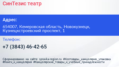 СинТезис, театр по адресу 654007, Кемеровская область, Новокузнецк, Кузнецкстроевский проспект, 1 в дальнейшем Организация, размещена в следующих категориях: