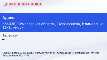 Церковная лавка по адресу 654038, Кемеровская область, Новокузнецк, Климасенко, 11/1а киоск в дальнейшем Организация, размещена в следующих категориях: