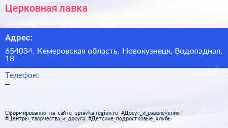 Церковная лавка по адресу 654034, Кемеровская область, Новокузнецк, Водопадная, 18 в дальнейшем Организация, размещена в следующих категориях: