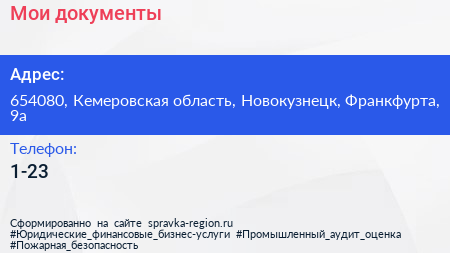 Мои документы по адресу 654080, Кемеровская область, Новокузнецк, Франкфурта, 9а в дальнейшем Организация, размещена в следующих категориях: