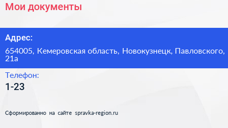 Мои документы по адресу 654005, Кемеровская область, Новокузнецк, Павловского, 21а в дальнейшем Организация, размещена в следующих категориях: