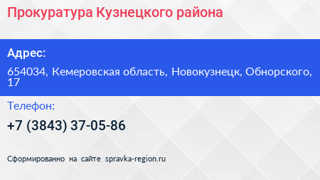 Прокуратура Кузнецкого района по адресу 654034, Кемеровская область, Новокузнецк, Обнорского, 17 в дальнейшем Организация, размещена в следующих категориях: