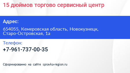 15 дюймов, торгово-сервисный центр по адресу 654055, Кемеровская область, Новокузнецк, Старо-Островская, 1а в дальнейшем Организация, размещена в следующих категориях: