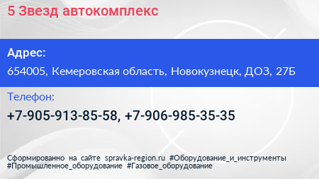 5 Звезд, автокомплекс по адресу 654005, Кемеровская область, Новокузнецк, ДОЗ, 27Б в дальнейшем Организация, размещена в следующих категориях: