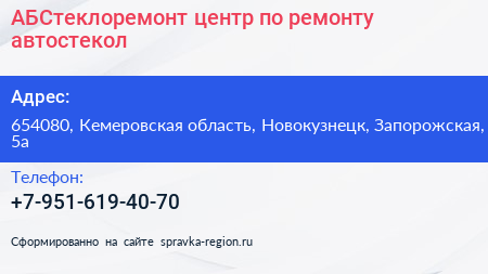 АБСтеклоремонт, центр по ремонту автостекол по адресу 654080, Кемеровская область, Новокузнецк, Запорожская, 5а в дальнейшем Организация, размещена в следующих категориях: