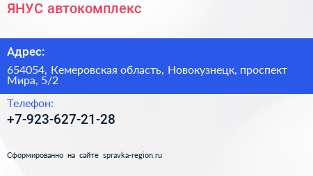 ЯНУС, автокомплекс по адресу 654054, Кемеровская область, Новокузнецк, проспект Мира, 5/2 в дальнейшем Организация, размещена в следующих категориях: