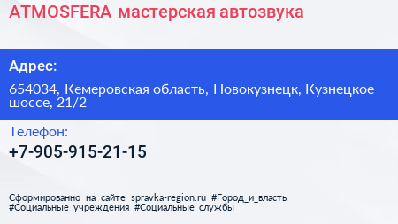 ATMOSFERA, мастерская автозвука по адресу 654034, Кемеровская область, Новокузнецк, Кузнецкое шоссе, 21/2 в дальнейшем Организация, размещена в следующих категориях: