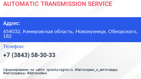 AUTOMATIC TRANSMISSION SERVICE по адресу 654032, Кемеровская область, Новокузнецк, Обнорского, 182 в дальнейшем Организация, размещена в следующих категориях: