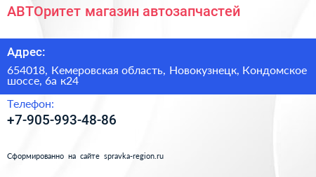 АВТОритет, магазин автозапчастей по адресу 654018, Кемеровская область, Новокузнецк, Кондомское шоссе, 6а к24 в дальнейшем Организация, размещена в следующих категориях: