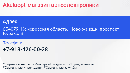 Akulaopt, магазин автоэлектроники по адресу 654079, Кемеровская область, Новокузнецк, проспект Курако, 8 в дальнейшем Организация, размещена в следующих категориях: