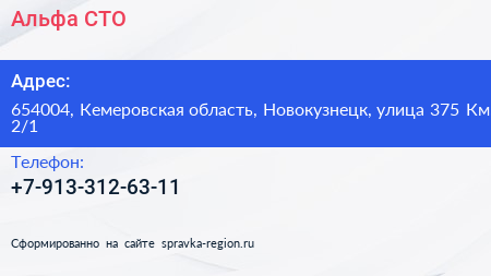 Альфа, СТО по адресу 654004, Кемеровская область, Новокузнецк, улица 375 Км, 2/1 в дальнейшем Организация, размещена в следующих категориях: