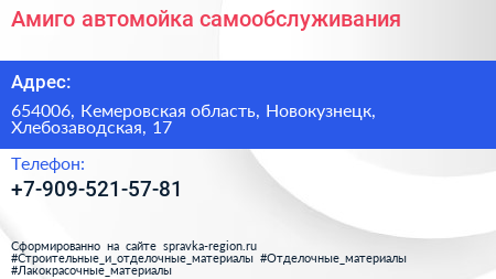 Амиго, автомойка самообслуживания по адресу 654006, Кемеровская область, Новокузнецк, Хлебозаводская, 17 в дальнейшем Организация, размещена в следующих категориях: