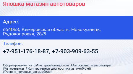 Япошка, магазин автотоваров по адресу 654063, Кемеровская область, Новокузнецк, Рудокопровая, 28/9 в дальнейшем Организация, размещена в следующих категориях: