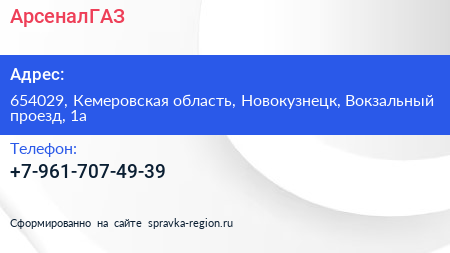 АрсеналГАЗ по адресу 654029, Кемеровская область, Новокузнецк, Вокзальный проезд, 1а в дальнейшем Организация, размещена в следующих категориях: