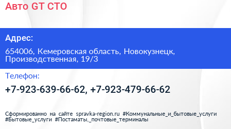 Авто-GT, СТО по адресу 654006, Кемеровская область, Новокузнецк, Производственная, 19/3 в дальнейшем Организация, размещена в следующих категориях: