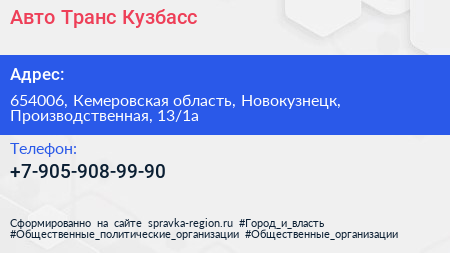 Авто Транс-Кузбасс по адресу 654006, Кемеровская область, Новокузнецк, Производственная, 13/1а в дальнейшем Организация, размещена в следующих категориях: