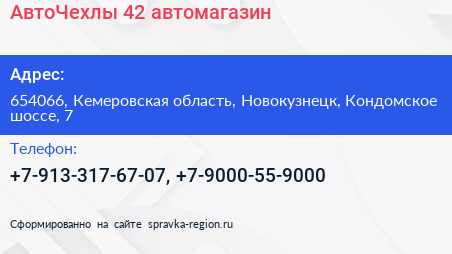 АвтоЧехлы 42, автомагазин по адресу 654066, Кемеровская область, Новокузнецк, Кондомское шоссе, 7 в дальнейшем Организация, размещена в следующих категориях: