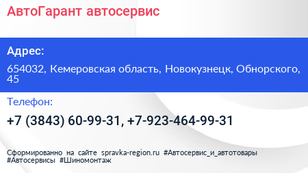 АвтоГарант, автосервис по адресу 654032, Кемеровская область, Новокузнецк, Обнорского, 45 в дальнейшем Организация, размещена в следующих категориях:
