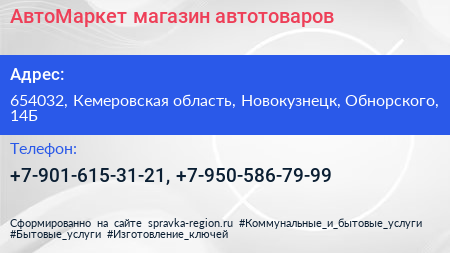 АвтоМаркет, магазин автотоваров по адресу 654032, Кемеровская область, Новокузнецк, Обнорского, 14Б в дальнейшем Организация, размещена в следующих категориях: