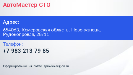 АвтоМастер, СТО по адресу 654063, Кемеровская область, Новокузнецк, Рудокопровая, 28/11 в дальнейшем Организация, размещена в следующих категориях: