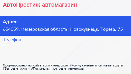 АвтоПрестиж, автомагазин по адресу 654059, Кемеровская область, Новокузнецк, Тореза, 75 в дальнейшем Организация, размещена в следующих категориях:
